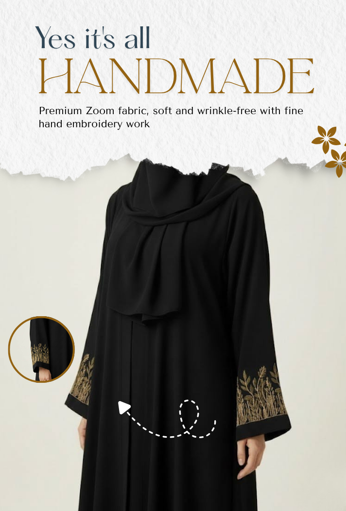 Zeenat Abaya is crafted from premium Zoom fabric, known for its wrinkle-free comfort and graceful fall. The hand embroidery adds that touch of luxury and feminine charm, perfect for work, get-togethers, or special occasions, bina over lagay.
